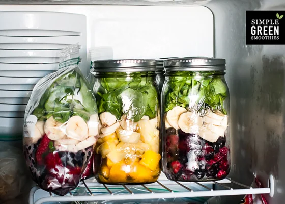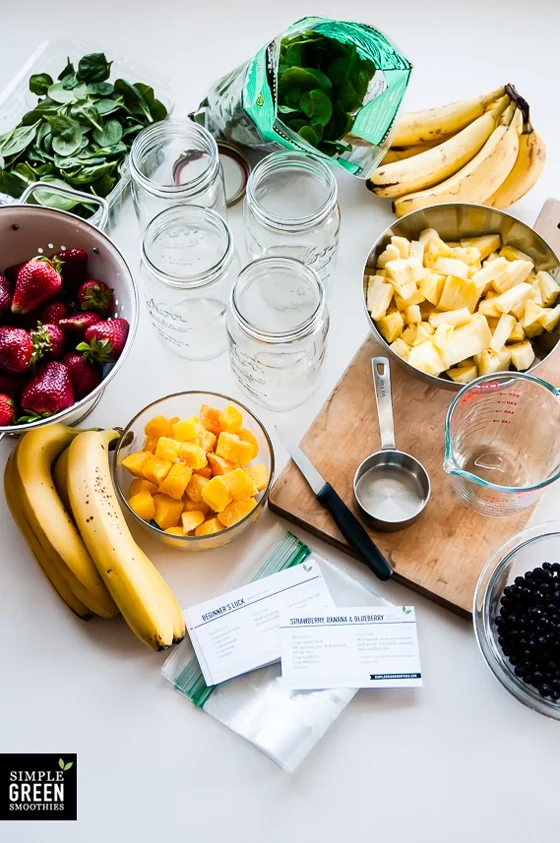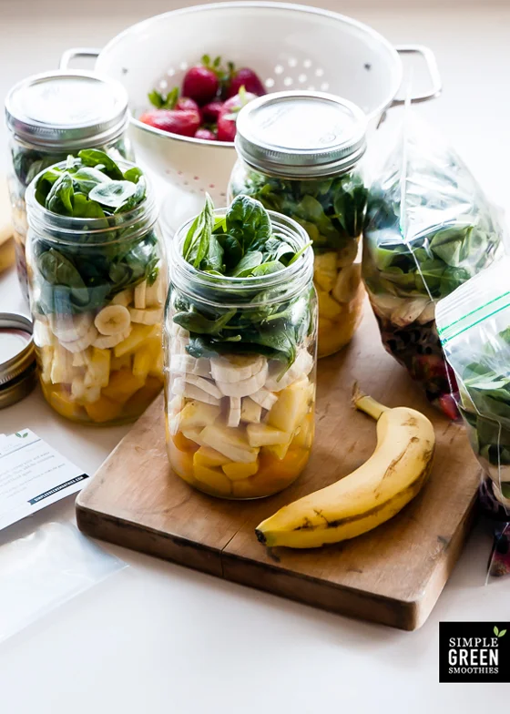 I prefer to use Ziplock bags, but jars are great too. I like to make the smoothie kits with things I ALWAYS like in my smoothies - pineapple, banana, berries, spinach. That way, when different things are in season I can add them, in addition with other veggies (carrots, beets, avocados, cucumber, etc), and still have the smoothie kit to make it a no-brainer winner.